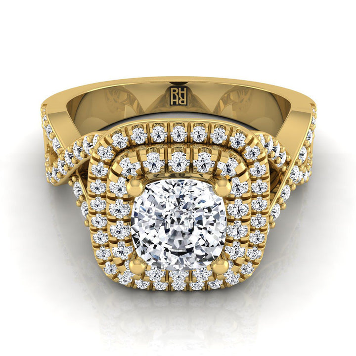 แหวนหมั้นเพชรทรงหมอนบิดทองคำเหลือง 14K ฝรั่งเศสประดับเพชรแบบพาเว่สองชั้น - 5/8 กะรัตรวม