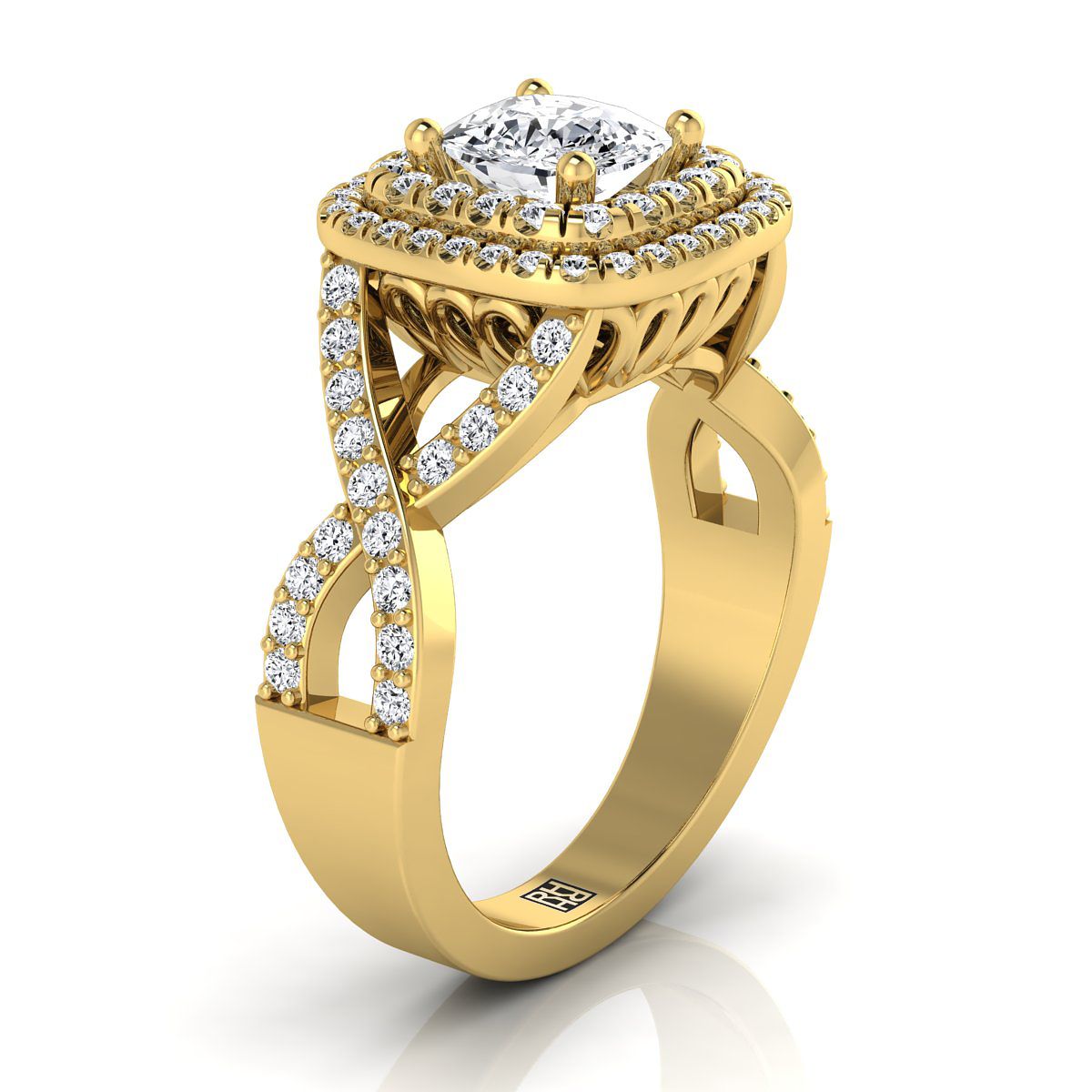 แหวนหมั้นเพชรทรงหมอนบิดแบบฝรั่งเศสประดับเพชรพาเว่สองชั้นทองคำเหลือง 18K - 5/8 กะรัตรวม