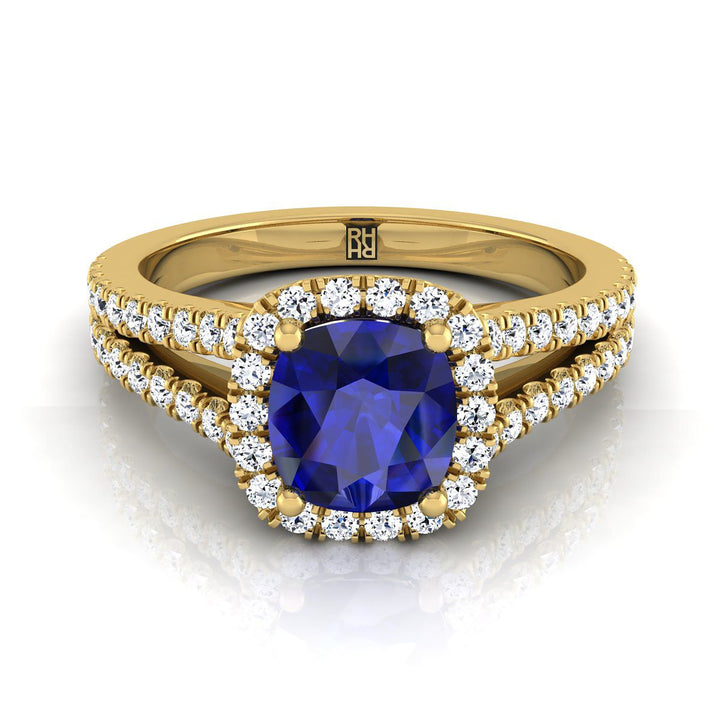 แหวนหมั้นทองคำเหลือง 18K ทรงหมอนประดับไพลินกลางแบบฮาโล่ พร้อมแถวเพชรฝรั่งเศสแบบแยกชิ้น - 3/8ctw