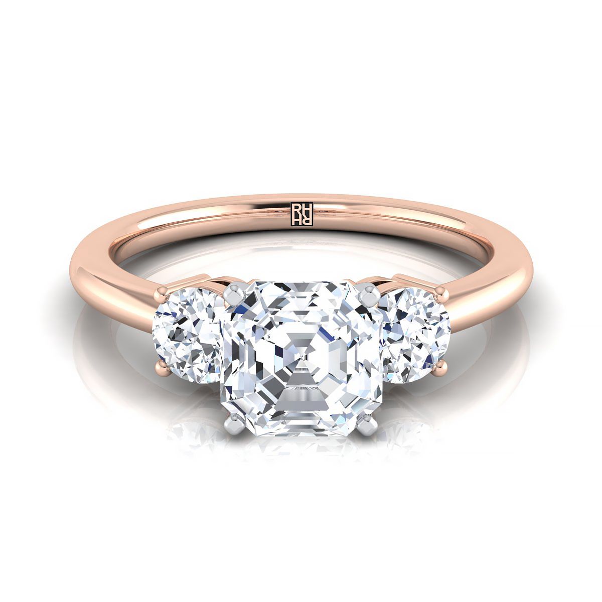 ความสง่างามที่เรียบง่าย แหวนหมั้นเพชร 3 ก้อนนี้มีการตั้งค่าที่แสดงให้เห็นถึงเพชรทรงแอสเชอร์ที่อยู่ตรงกลางและเพชรกลมที่สวยงามด้านข้าง (h-i/vs 0.25ctw) ตั้งอยู่ในทองคำกุหลาบ 14k อย่างประณีต