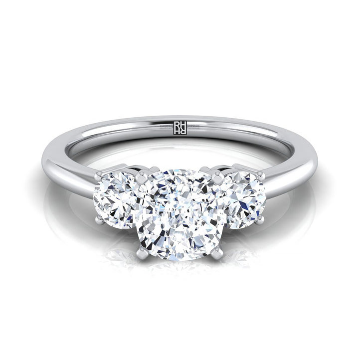 ความสง่างามที่เรียบง่าย ตัวเรือนแหวนหมั้นเพชร 3 เม็ดนี้แสดงให้เห็นถึงเพชรเม็ดกลางทรงหมอนและเพชรข้างทรงกลมเจิดจรัส (h-i/vs 0.25ctw) ประณีตในการฝังหนามเตยในทองคำขาว 18 กะรัต