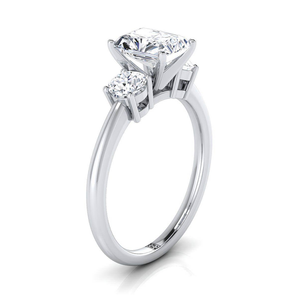 ความสง่างามที่เรียบง่าย ตัวเรือนแหวนหมั้นเพชร 3 เม็ดนี้แสดงให้เห็นถึงเพชรเม็ดกลางแบบ Radiant Cut และเพชรข้างแบบ Round Brilliant (h-i/vs 0.25ctw) ที่ประณีตติดตั้งด้วยหนามเตยในทองคำขาว 18 กะรัต