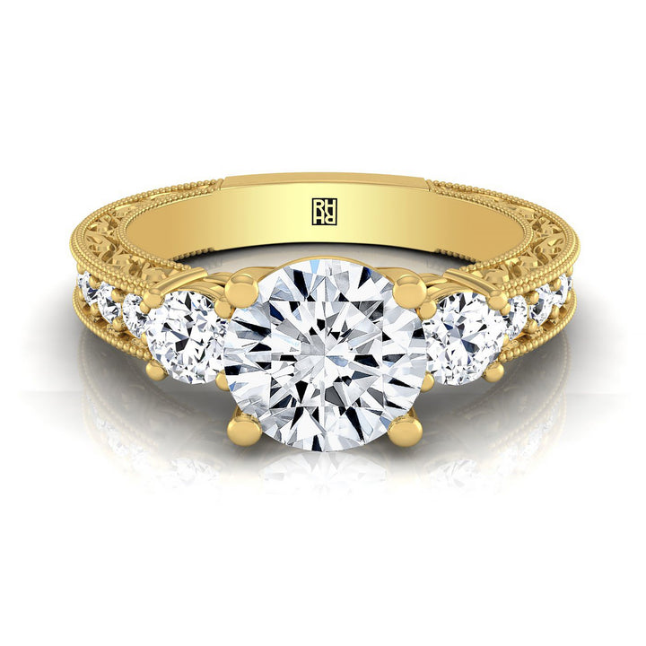แหวนหมั้นช่องแบบวินเทจสามเม็ดสลักมือเพชรทรงกลมเจียระไนแบบ Brilliant ทองคำเหลือง 14K - 3/4ctw