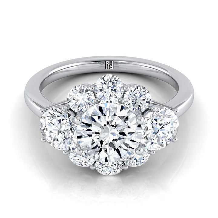 แหวนหมั้นเพชรสามเม็ดสไตล์โมเดิร์นทรงกลมเจียระไนแบบ Brilliant ประดับเพชรดอกไม้ทองคำขาว 18K -1-3/4ctw