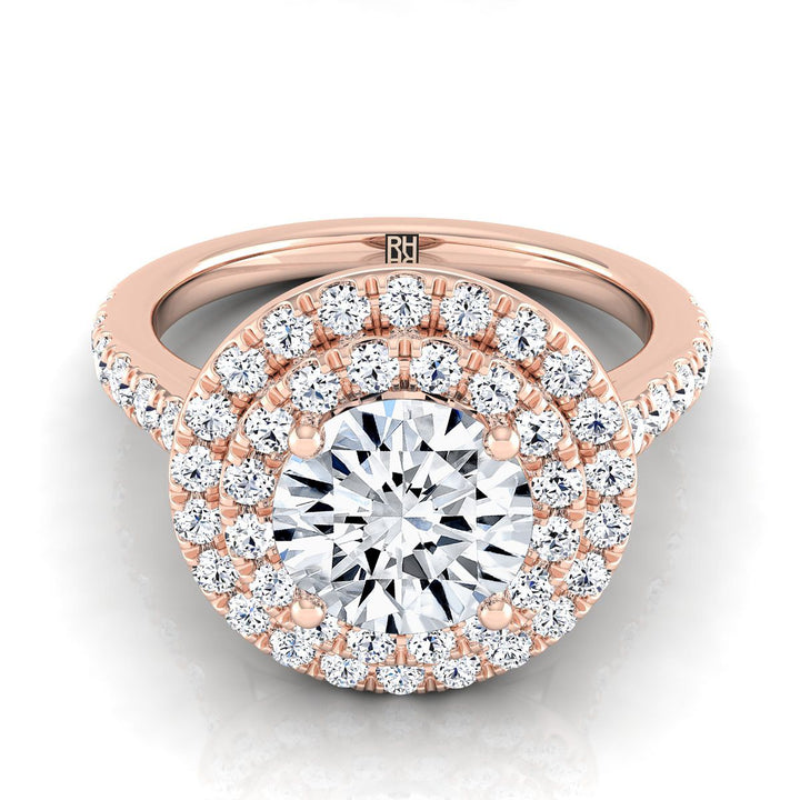 แหวนหมั้นเพชรทรงกลมเจียระไนแบบ Brilliant แบบ Double Pave Halo ทองกุหลาบ 14K พร้อมเพชรเส้นตรง - 3/4ctw