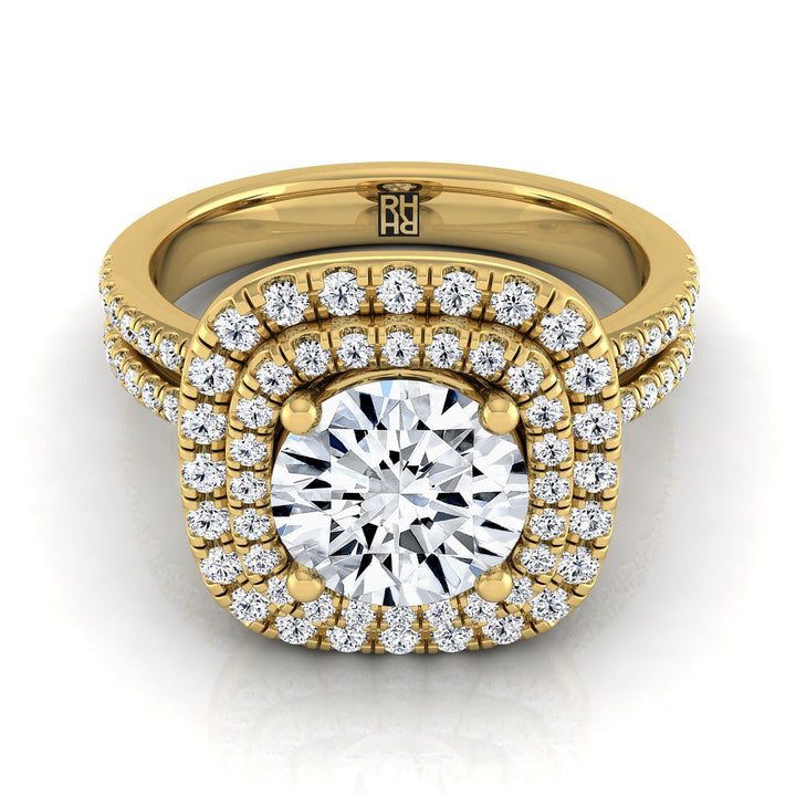 แหวนหมั้นแบบดับเบิลเพฟ ฮาโลว์ที่ทำด้วยมืออย่างประณีตนี้ โชว์เพชรเจียระไนแบบบริลเลียนต์คัท (h-i/vs 0.45 Ctw) ที่ประดับอย่างสวยงามในตัวเรือนทองคำเหลือง 18k คลาสสิก