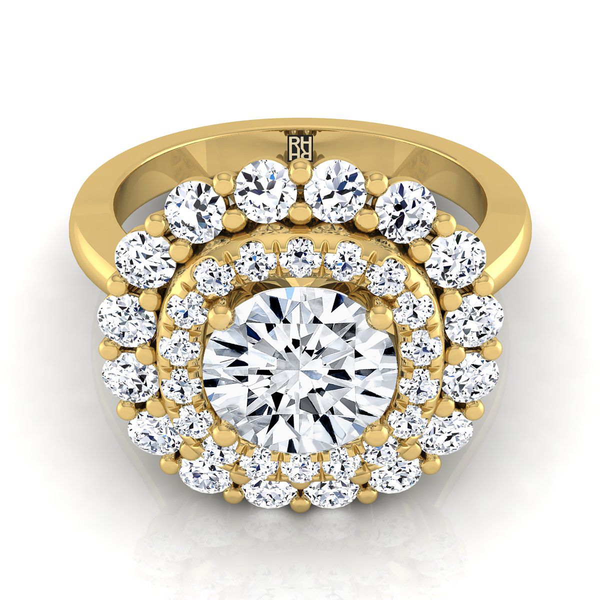 แหวนหมั้นเพชรทรงกลมเจียระไนแบบ Brilliant สีเหลืองทอง 14K แบบดอกไม้ล้อมสองชั้นพร้อมลายแสงอาทิตย์ - 1ctw
