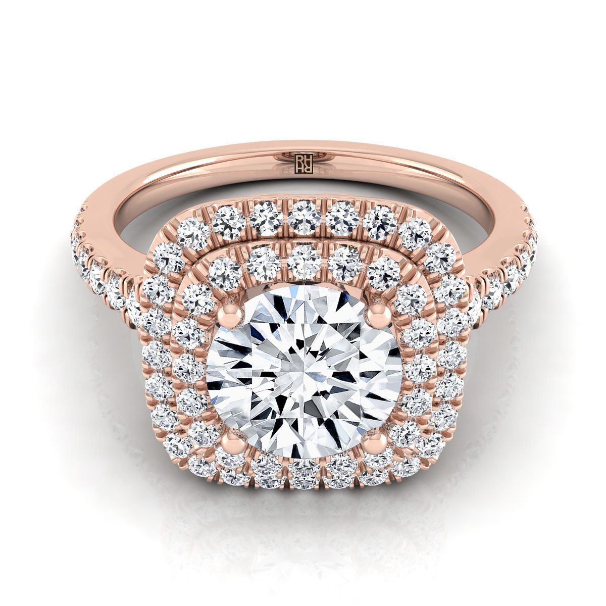 แหวนหมั้นเพชรทรงกลมเจียระไนแบบ Brilliant สีโรสโกลด์ 14K พร้อมดีไซน์ Double Halo และ Pavé ขอบหยัก - 1/2ctw