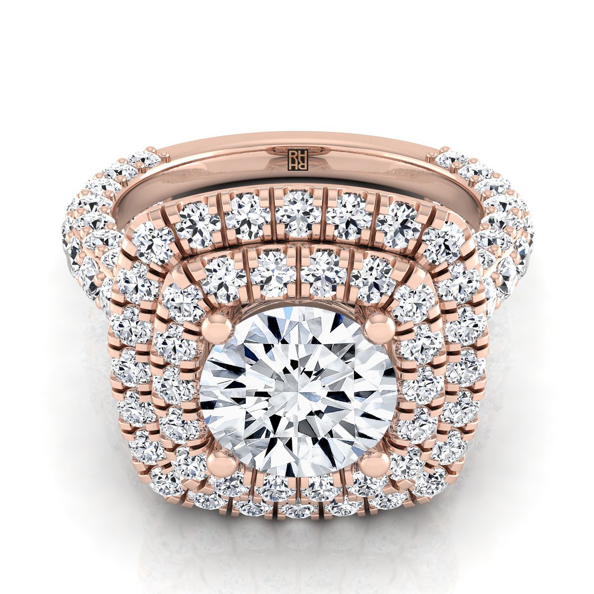 แหวนหมั้นทองคำชมพู 14K ประดับเพชรทรงกลมเจียระไนแบบ Brilliant แบบหนาและหรูหราพร้อม Double Halo แบบฝรั่งเศส Pave - 2ctw