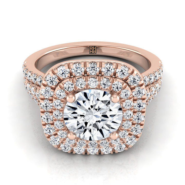 แหวนหมั้นเพชรทรงกลมเจียระไนแบบ Brilliant สีโรสโกลด์ 14K แบบสี่แถว แยกชั้น พร้อมเพชรประดับแบบ Pave และ Double Halo น้ำหนักรวม 7/8 กะรัต
