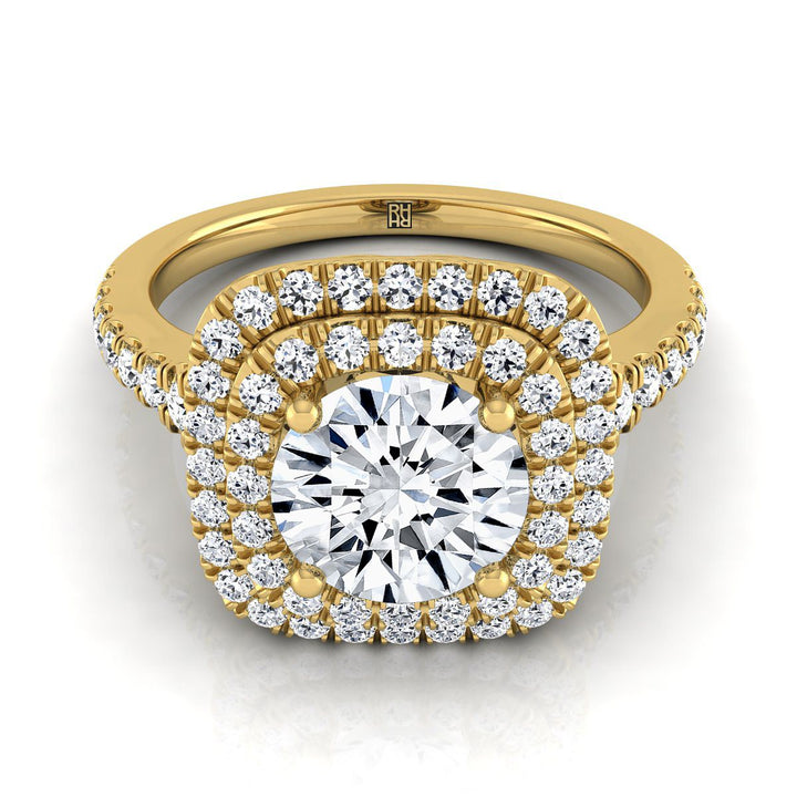 แถลงการณ์สไตล์ที่สง่างาม แหวนหมั้นแบบดับเบิลฮาโลพาเว่แสดงให้เห็นเพชรเจียระไนแบบบริลเลียนต์คัท (h-i/vs 0.55ctw) พร้อมกับชิ้นแหวนพาเว่ที่ประณีตติดตั้งในตัวเรือนทองคำเหลือง 14k