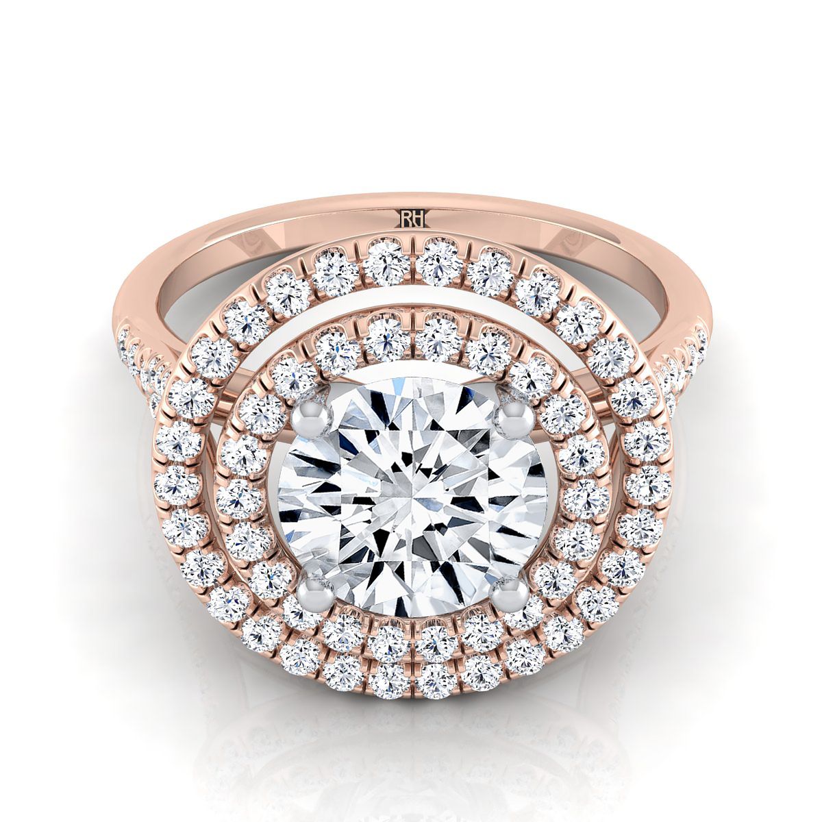 แหวนหมั้นเพชรทรงกลมเจียระไนแบบ Brilliant แบบ Double Halo ตัวเรือนแยกชิ้นประดับเพชรแบบ Pave ทองกุหลาบ 14K - 1/2ctw