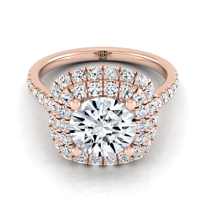แหวนเพชรหมั้น 14K ทองกุหลาบทรงกลมเจียระไนแบบ Brilliant พร้อม Double Halo และ Linear Pave - 3/4ctw