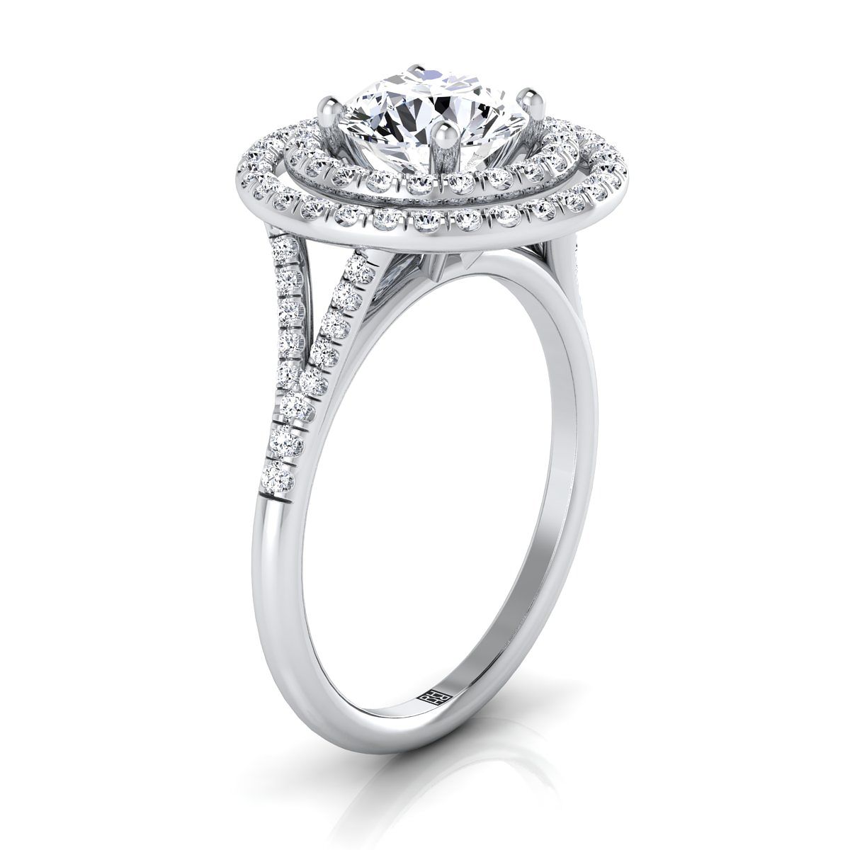 แหวนหมั้นแบบดับเบิลฮาโลที่ทำด้วยมืออย่างประณีตนี้ โชว์เพชรเจียระไนประกายแวววาว (h-i/vs 0.50ctw) ที่ประดับอย่างสวยงามในตัวเรือนทองคำขาว 14 กะรัตแบบคลาสสิก