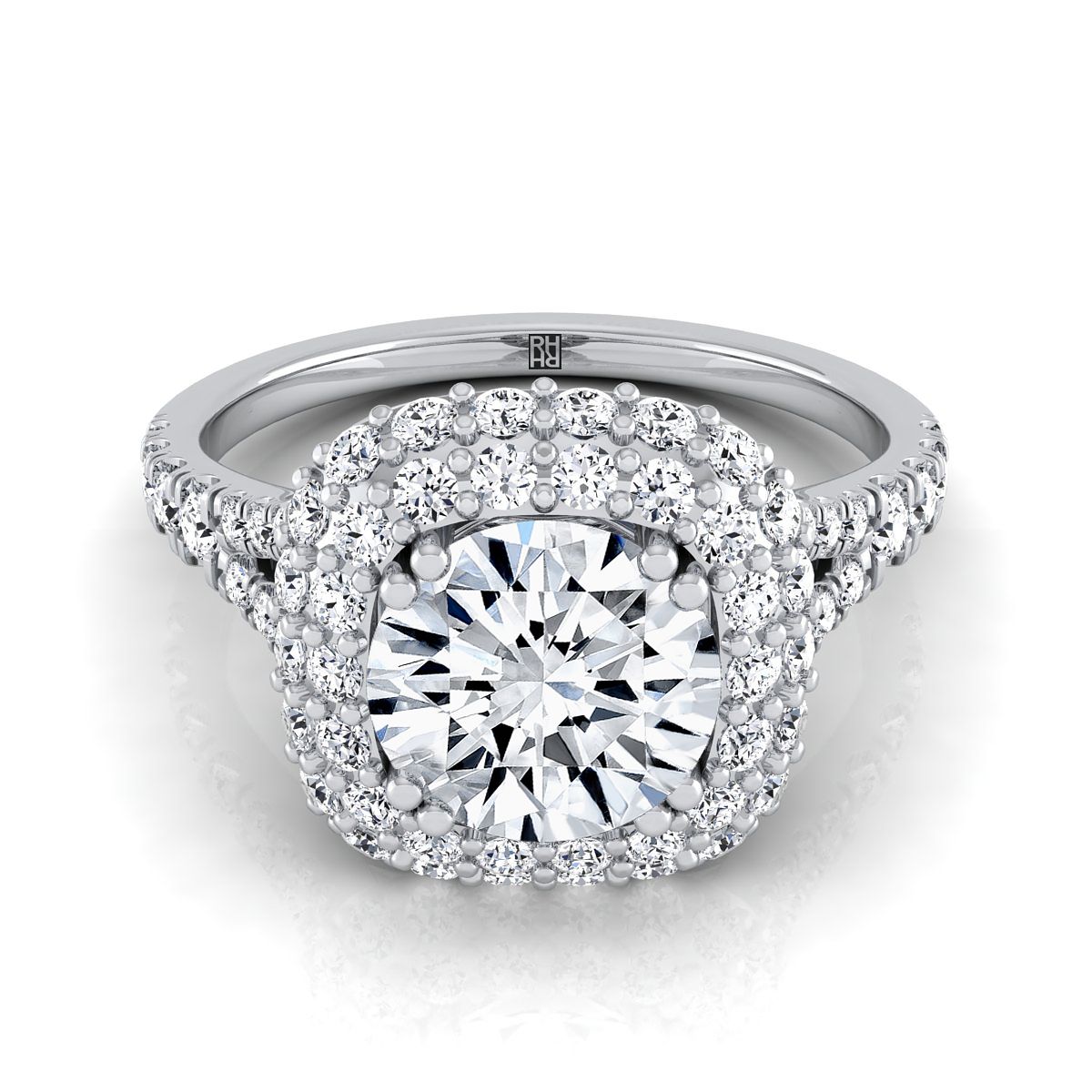 แหวนหมั้นแบบดับเบิลฮาโลที่ทำด้วยมืออย่างประณีตนี้ โชว์เพชรเจียระไนแบบ Brilliant Cut (h-i/vs 0.60ctw) ที่ประดับอย่างสวยงามในตัวเรือนทองคำขาว 14 กะรัตแบบคลาสสิก
