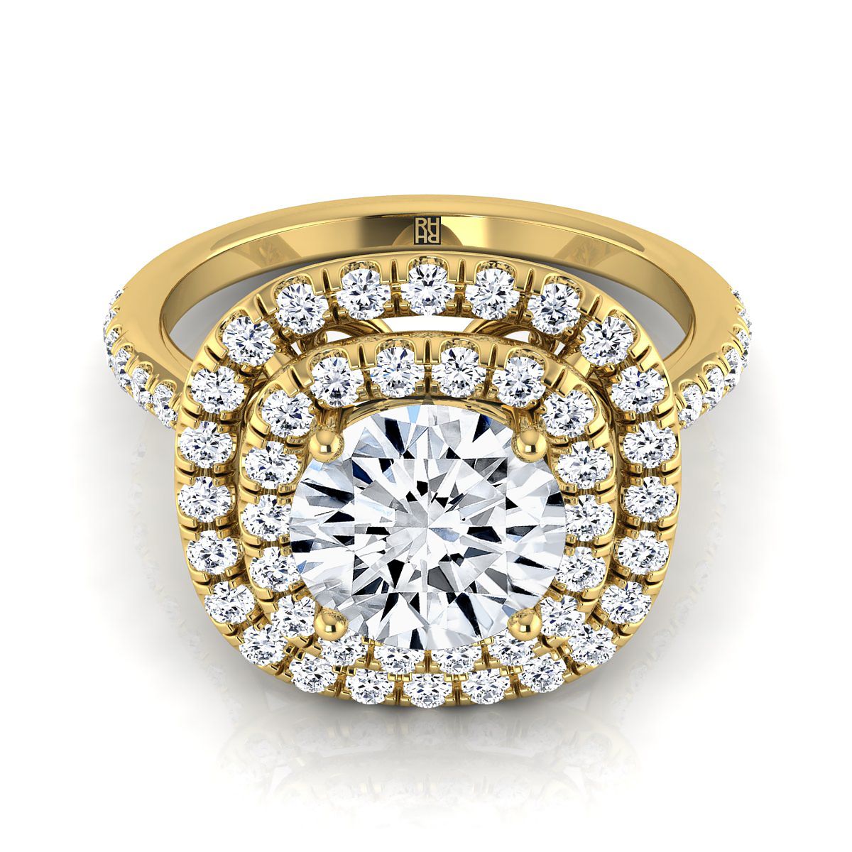 แหวนหมั้นเพชรทรงกลมเจียระไนแบบ Brilliant สีเหลืองทอง 18K แบบ Double Halo ขอบหยักแบบ Pavé - 1/2ctw
