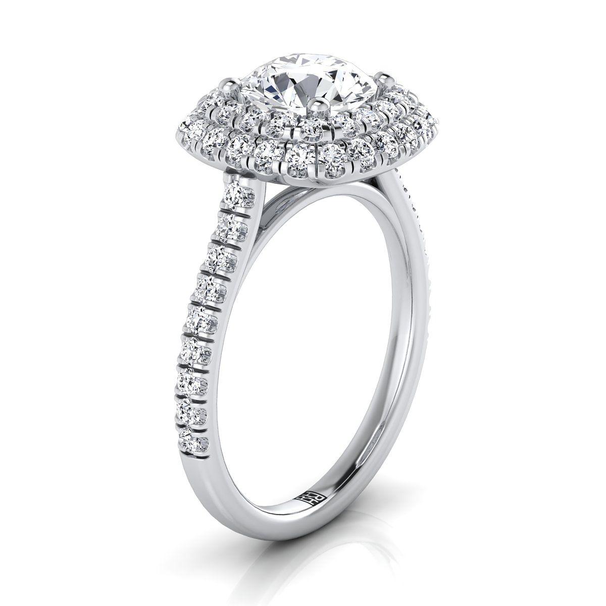 แหวนหมั้นแบบดับเบิลฮาโลที่ทำด้วยมืออย่างประณีตนี้แสดงให้เห็นเพชรเจียระไนแบบ Brilliant Cut (h-i/vs 0.75ctw) ที่สวยงามซึ่งถูกประดับในตัวเรือนแพลตตินัมคลาสสิก
