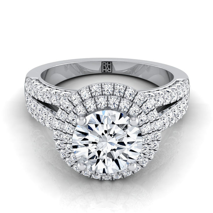 แถลงการณ์สไตล์ที่สง่างาม แหวนหมั้นแบบวงกลมคู่ Halo Pave นี้แสดงให้เห็นเพชรเจียระไนแบบ Brilliant Cut (h-i/vs 0.90ctw) พร้อมกับก้านแหวนแบบ Pave ที่ประณีต ติดตั้งในตัวเรือนทองคำขาว 18k