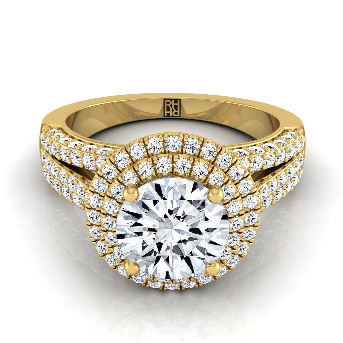 แถลงการณ์สไตล์ที่สง่างาม แหวนหมั้นแบบวงกลมคู่ Halo Pave นี้แสดงให้เห็นเพชรเจียระไนแบบ Brilliant Cut (h-i/vs 0.90ctw) พร้อมกับแถบ Pave ที่ประณีตติดตั้งในตัวเรือนทองคำเหลือง 18k