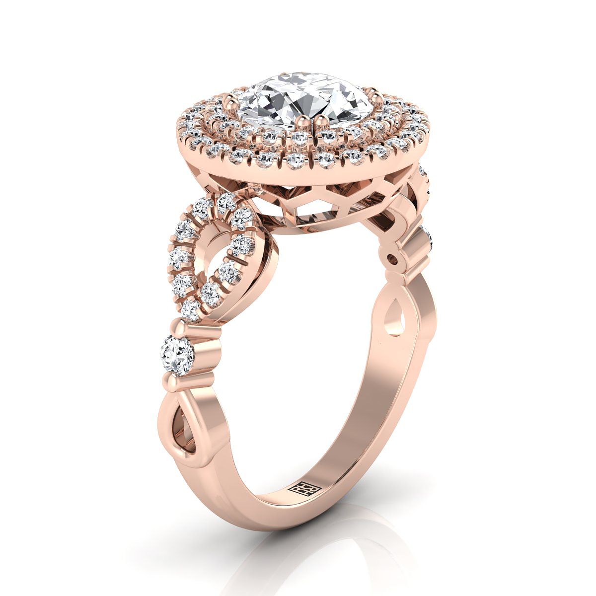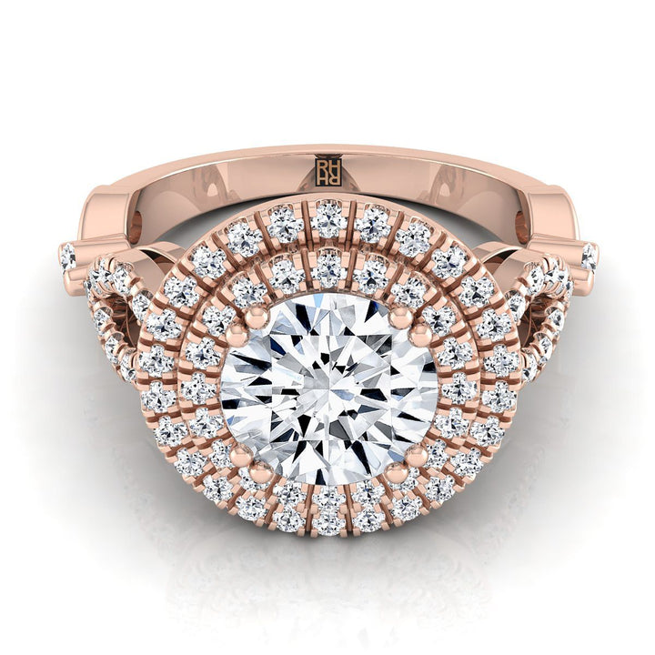 แหวนหมั้นเพชรทรงกลมเจียระไนแบบ Brilliant สีโรสโกลด์ 14K ขอบหยักแบบ Pavé เปิดด้านข้าง พร้อมฮาโลคู่เพชร 1/2ctw