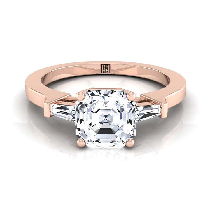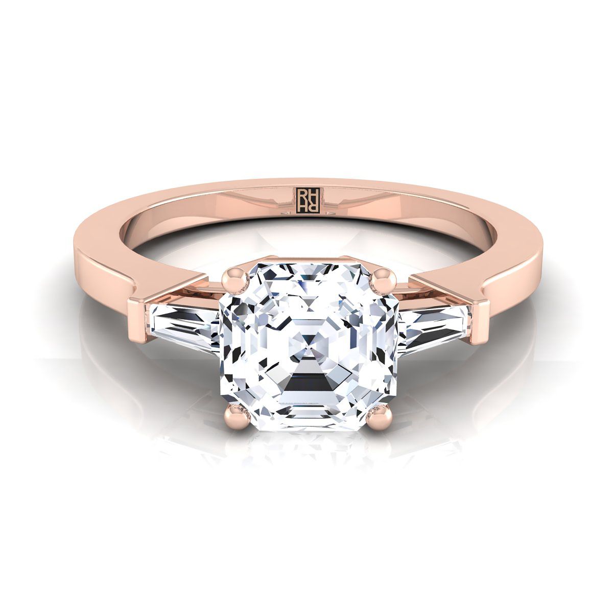 ความสง่างามที่เรียบง่าย แหวนหมั้นเพชรนี้มีการตั้งค่ากลางแบบ Asscher Cut และ Baguettes ที่เรียวลง (h-i/vs 0.25ctw) ตั้งอยู่ในทองคำกุหลาบ 14k อย่างประณีต