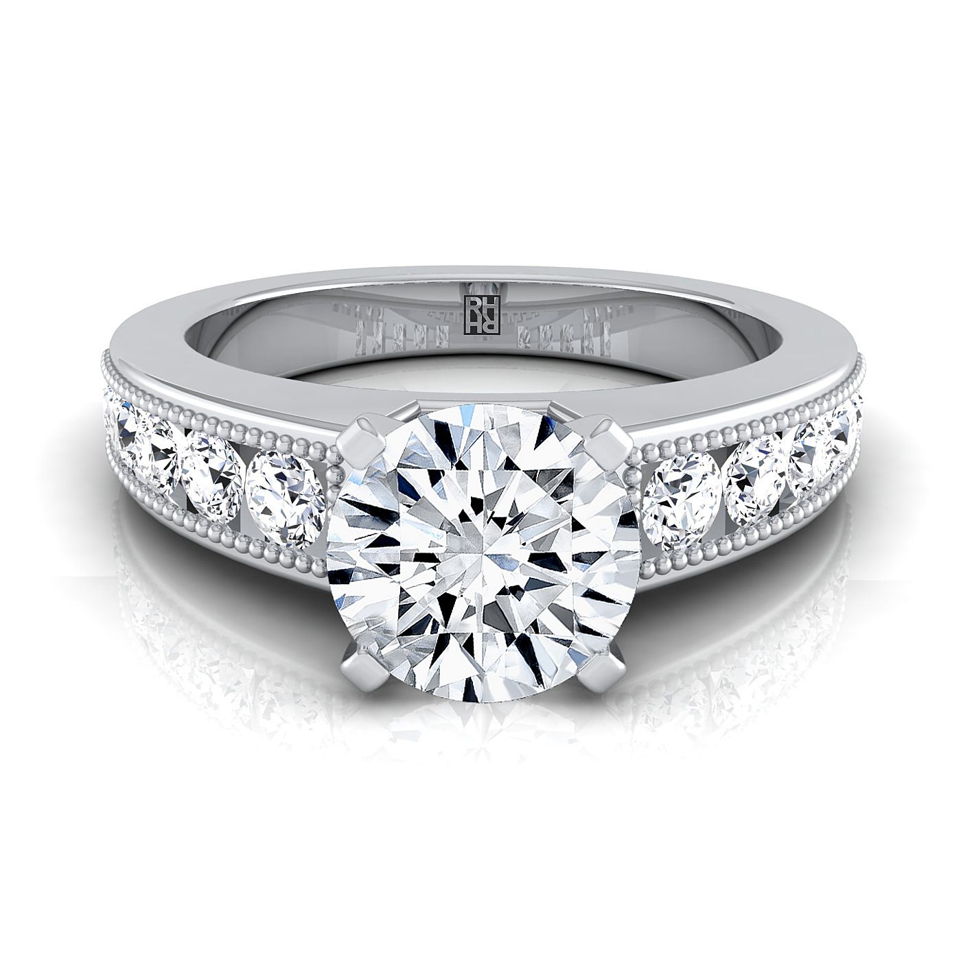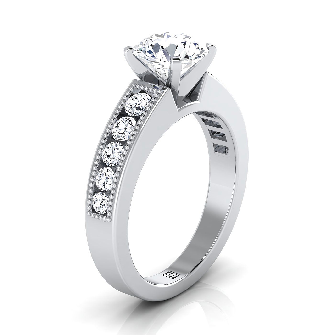 แหวนหมั้นทองคำขาว 18K ประดับเพชรวงกลมเจียระไนแบบบริลเลียนต์ โบราณ พร้อมเม็ดมิลเกรนและการฝังแบบแชนเนล - 1/2ctw