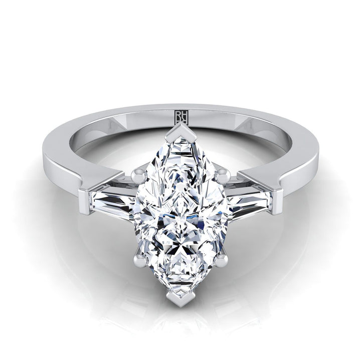 ความสง่างามที่เรียบง่าย, ตัวเรือนแหวนหมั้นเพชรนี้แสดงให้เห็นถึงเพชรทรงมาร์คีส์ตรงกลางและเพชรบาแกตต์ทรงเรียว (h-i/vs 0.25ctw) ประดับอย่างประณีตในแพลตตินัม