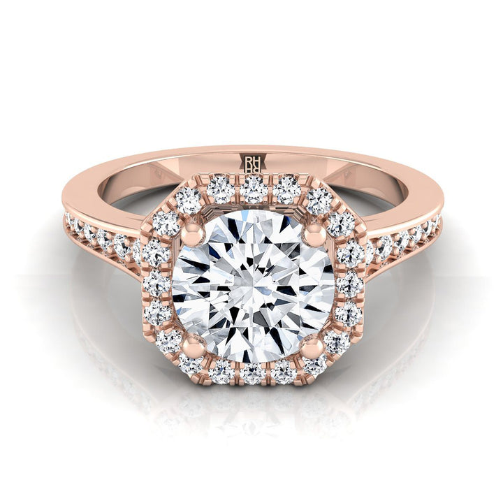แหวนหมั้นเพชรทรงกลมเจียระไนแบบคลาสสิก 14K โรสโกลด์ พร้อมฮาโลและแชนแนลฝรั่งเศสปาเว่ - 1/3ctw