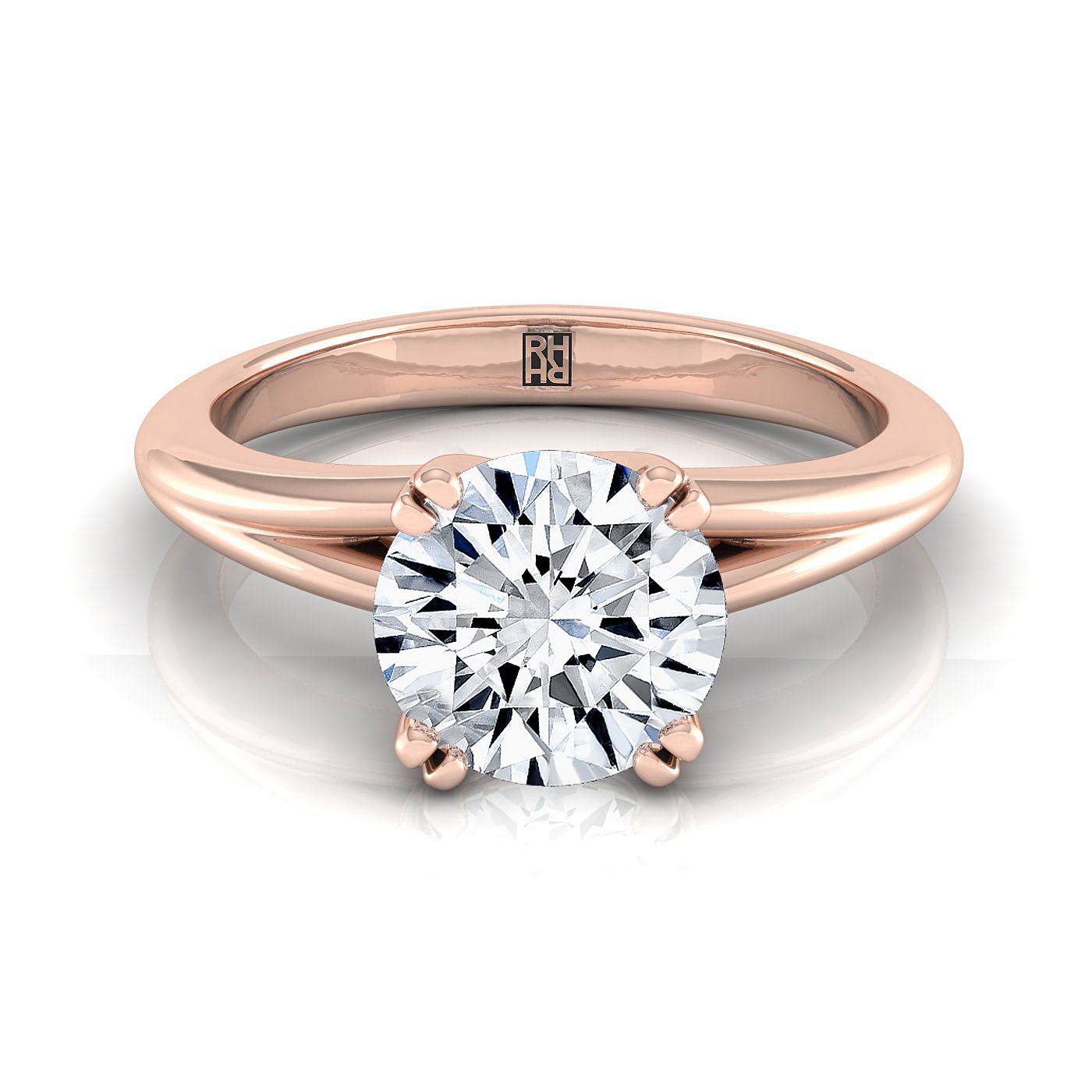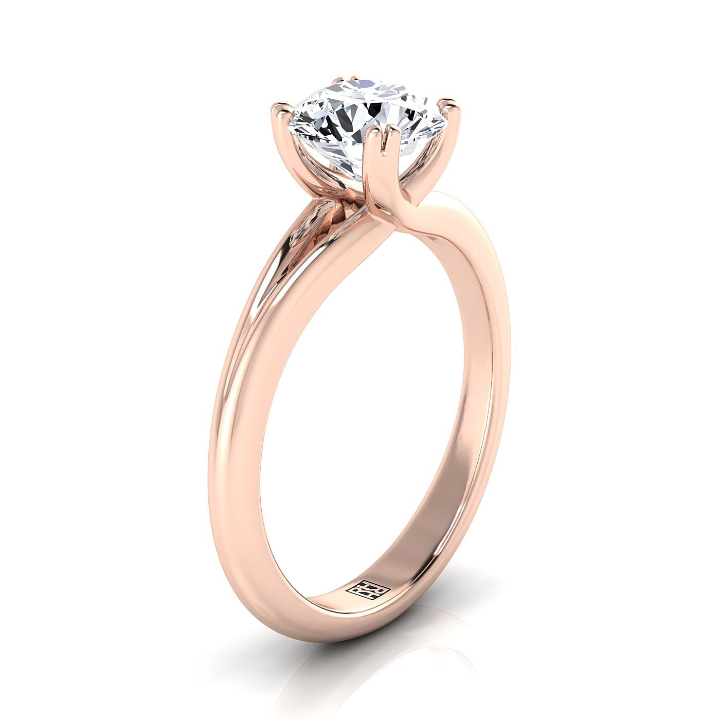 คลาสสิกและสง่างาม แหวนหมั้นเพชรเจียระไนประกายนี้พร้อมก้านแหวนโค้งมนในทองกุหลาบ 14 กะรัต