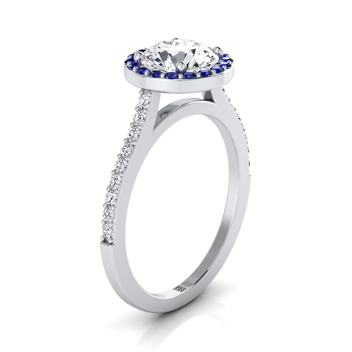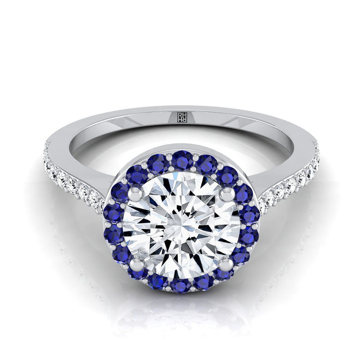 แหวนหมั้นแบบคลาสสิกฝรั่งเศสประดับเพชรทรงกลมเจียระไนแบบบริลเลียนท์แพลตตินัม พร้อมแซฟไฟร์สีน้ำเงินแบบฮาโลและเส้นตรง - 1/6 กะรัตรวม