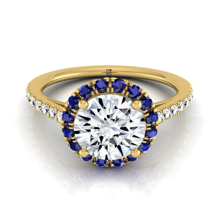 แหวนหมั้นประดับไพลินทรงกลมเจียระไนแบบบริลเลียนต์สีเหลืองทอง 18K พร้อมเพชรฝรั่งเศสแบบพาเว่ขนาดเล็กแบบฮาโล