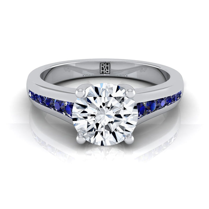 แหวนหมั้นช่องประดับไพลินสีน้ำเงินทรงกลมเจียระไนแบบร่วมสมัยทองคำขาว 18K ทรงเรียว