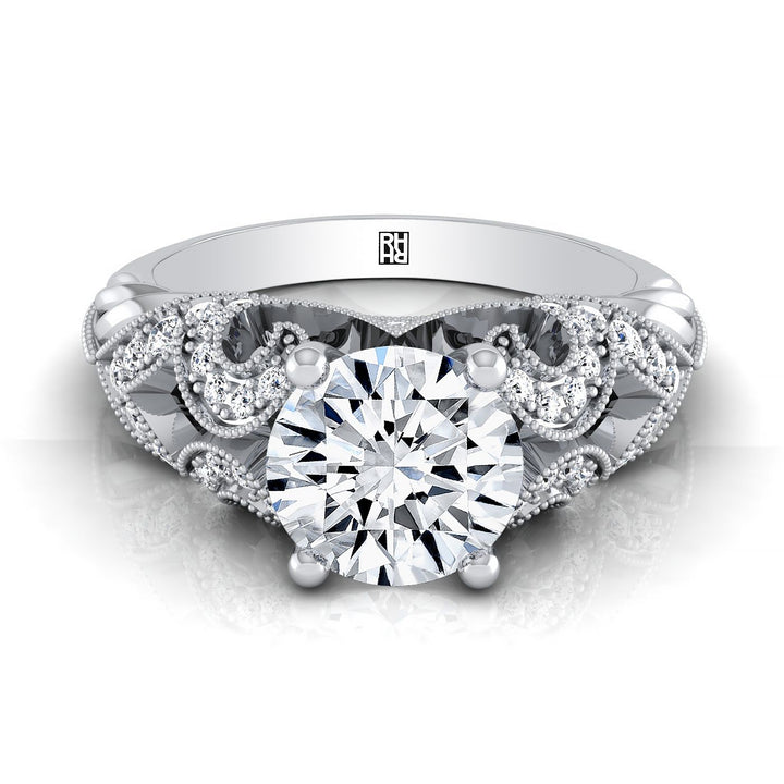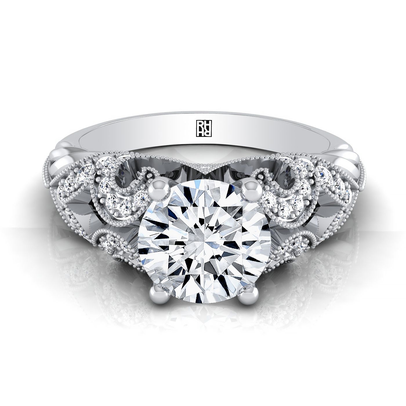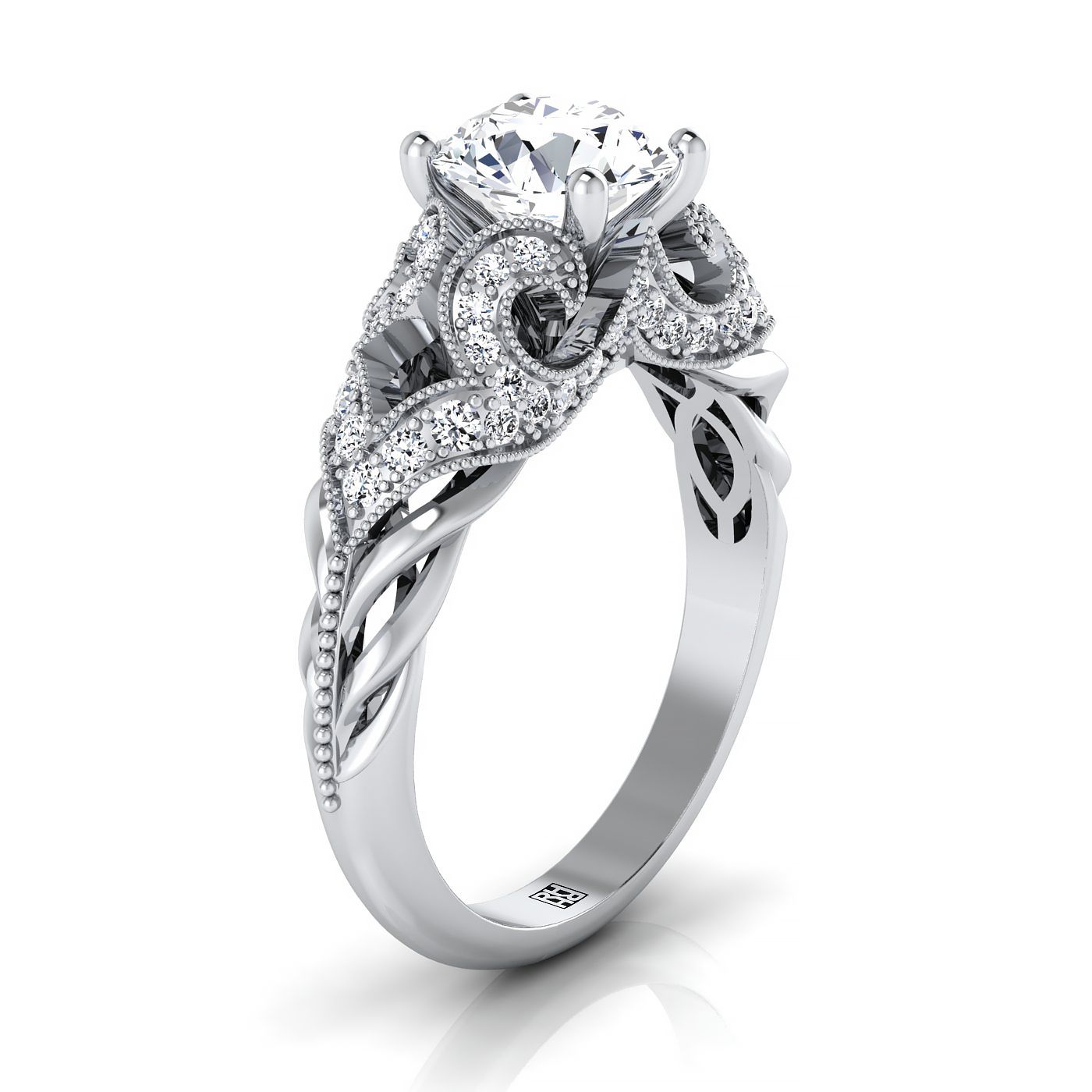 แหวนหมั้นเพชรสไตล์วินเทจพร้อมงานแกะสลักลายม้วนและรายละเอียดการประดับเม็ดบีด มีเพชรเมเล่ทรงกลมเจียระไนแบบ Brilliant (h-i/vs 0.33ctw) ประดับบนตัวเรือนทองคำขาว 14 กะรัต