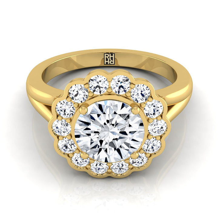 14K ทองคำเหลือง ทรงกลมเจียระไนแบบ Brilliant ล้อมเพชรลายดอกไม้ แหวนวงแยกแบบเรียบ -3/8 กะรัตรวม