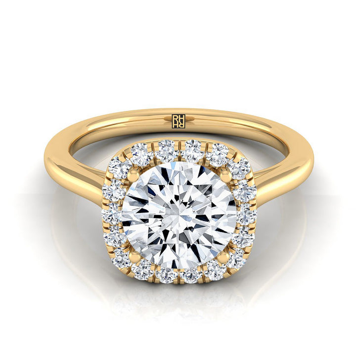 แสดงสไตล์อย่างสง่างาม แหวนหมั้นทรงสแควร์ฮาโลนี้พร้อมก้านแหวนขัดเงาสูง โชว์เพชรเจียระไนแบบ Brilliant Cut (h-i/vs 0.20ctw) ที่ประดับอย่างสวยงามในตัวเรือนทองคำเหลือง 18k คลาสสิก