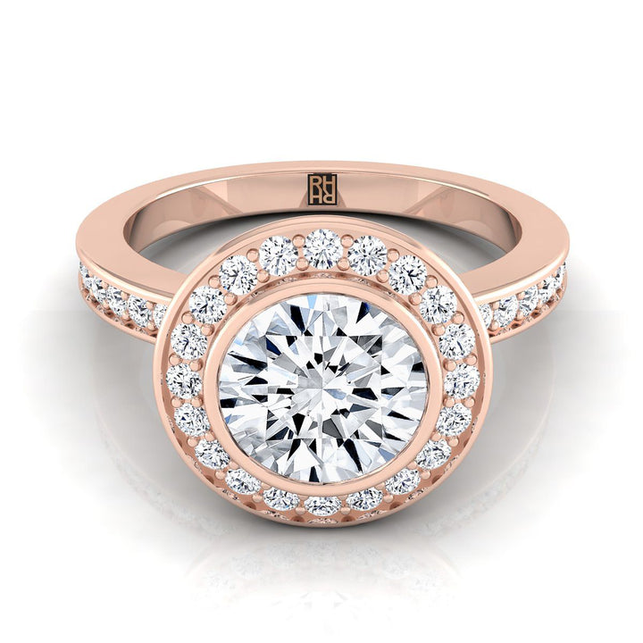 แหวนหมั้นทองคำชมพู 14K ประดับเพชรทรงกลมเจียระไนแบบ Brilliant พร้อมวงแหวน Halo และ Channel Band - 3/8ctw