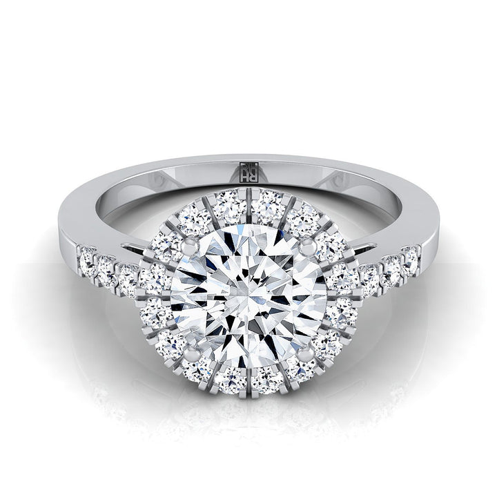 คลาสสิกและสง่างาม แหวนหมั้นเพชรทรง Brilliant Cut Halo นี้พร้อมก้านแหวนแบบ Pave โชว์เพชรทรง Brilliant Cut (h-i/vs 0.33ctw) ที่ประดับอย่างสวยงามในตัวเรือนทองคำขาว 14k แบบคลาสสิก