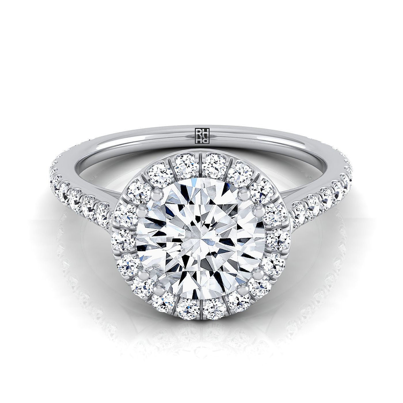 คลาสสิกและสง่างาม แหวนหมั้นเพชรแบบวงแหวนล้อมนี้พร้อมก้านแหวนแบบปาเว่ แสดงให้เห็นเพชรเจียระไนแบบบริลเลียนต์ (h-i/vs 0.45ctw) ที่ประดับอย่างสวยงามในตัวเรือนทองคำขาว 14 กะรัตแบบคลาสสิก