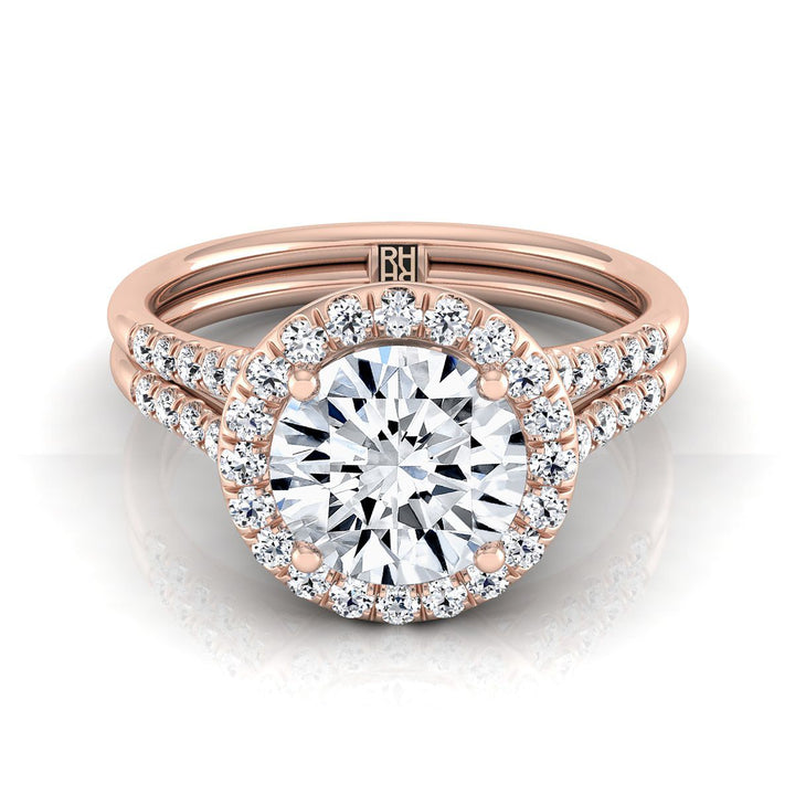 แหวนหมั้นทองคำชมพู 14K ทรงกลมเจียระไนแบบบริลเลียนต์ ฝรั่งเศสประดับเพชรแบบปาเว่ แยกช้างแหวนแบบฮาโล - 3/8ctw