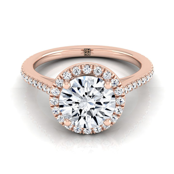 แหวนหมั้นแบบคลาสสิกฝรั่งเศสประดับเพชรทรงกลมเจียระไนแบบบริลเลียนต์ 14K โรสโกลด์ พร้อมฮาโลและเส้นตรง - 1/4ctw