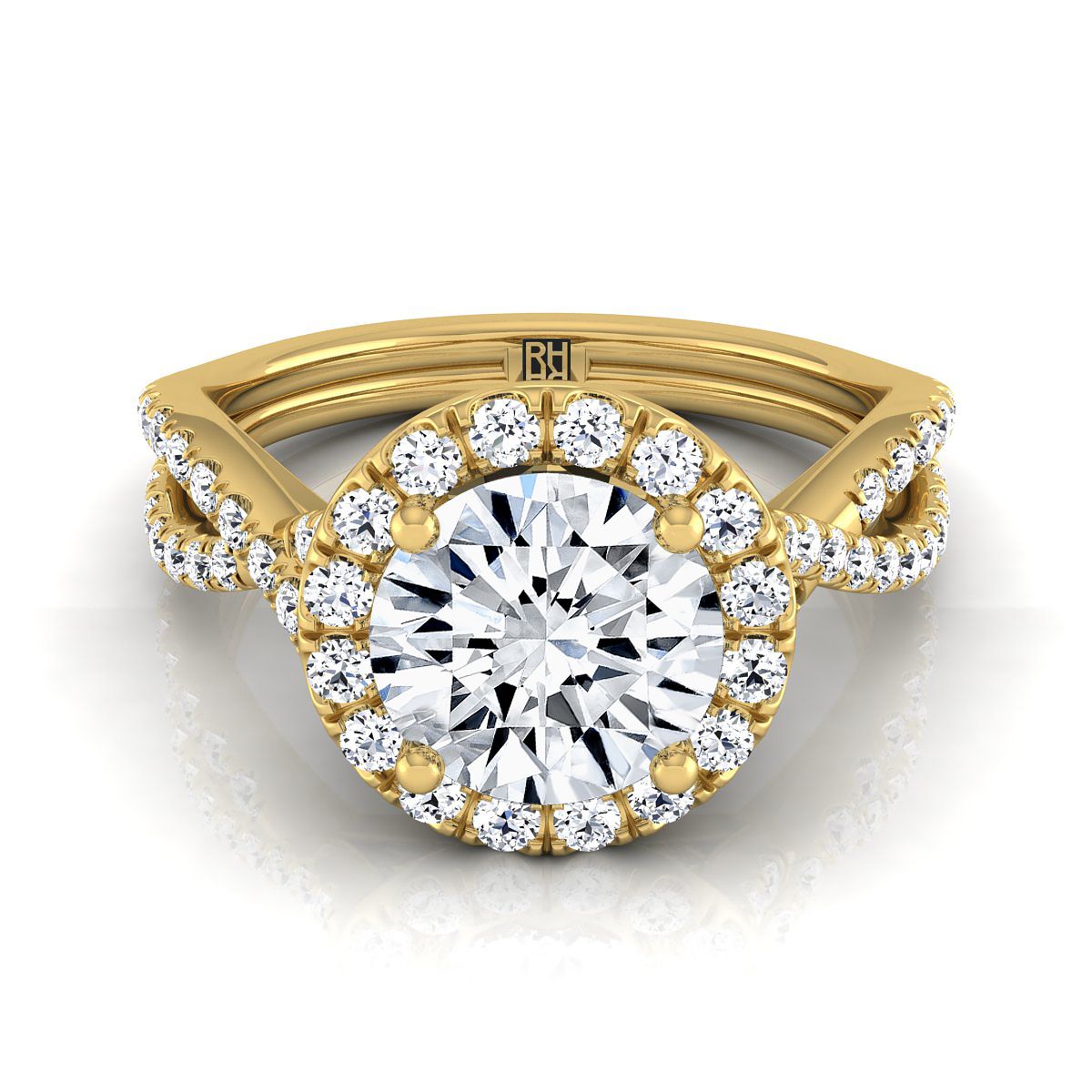 แหวนหมั้นกลางเพชรทรงกลมเจียระไนแบบ Brilliant สีทองเหลือง 14K ดีไซน์บิดเป็นลายขอบหยักแบบ Pavé Halo น้ำหนักรวม 1/2 กะรัต