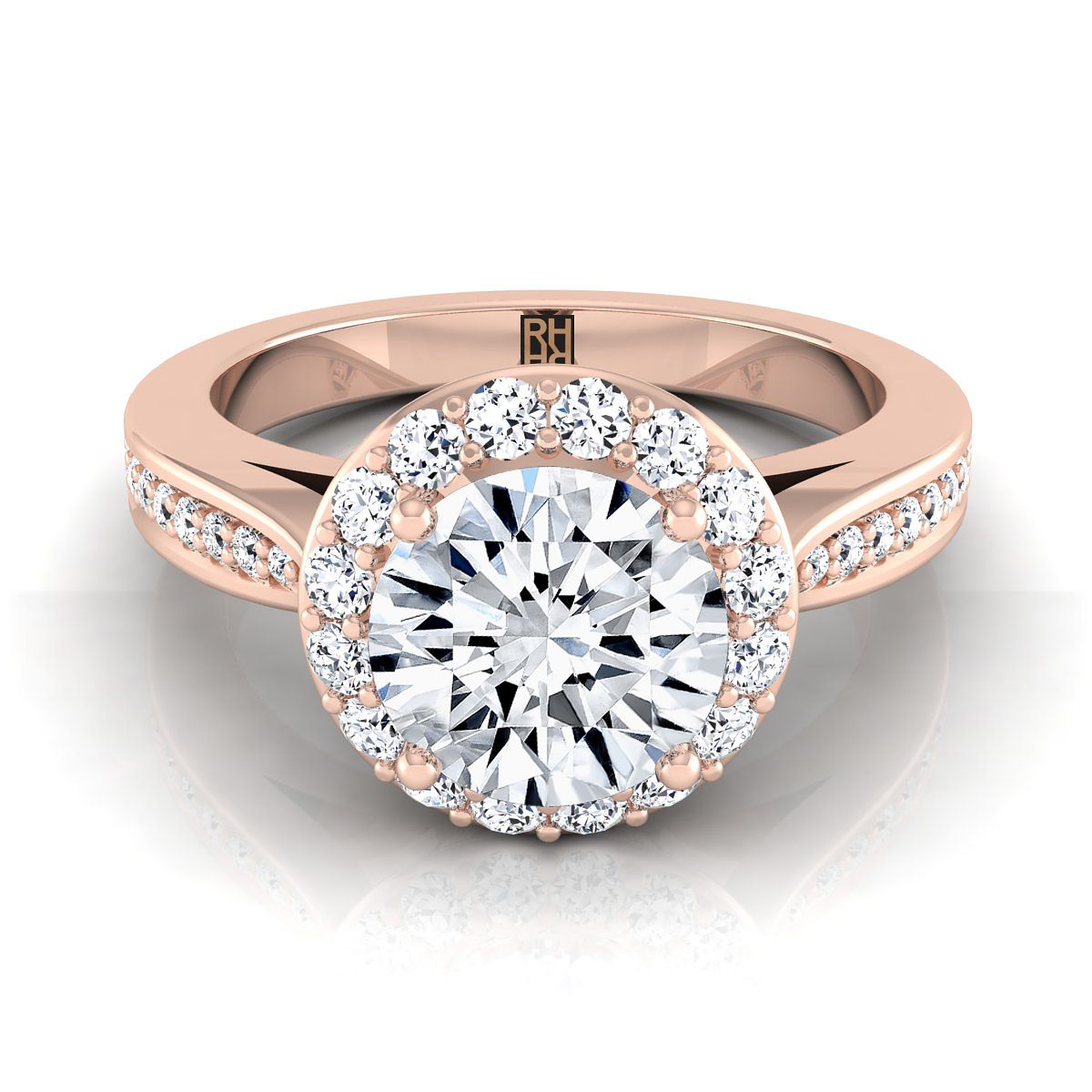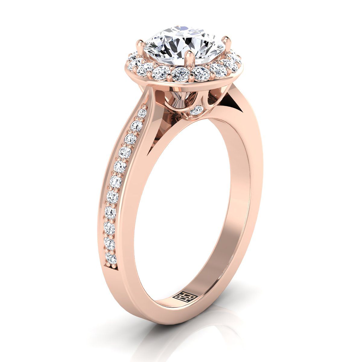 แสดงออกถึงสไตล์ที่สง่างาม แหวนหมั้น Halo นี้พร้อมกับเพชรประดับแบบ Pave Shank โชว์เพชรเจียระไนแบบ Brilliant Cut (h-i/vs 0.45ctw) ที่ถูกจัดวางอย่างสวยงามในตัวเรือนทองกุหลาบ 14k คลาสสิก