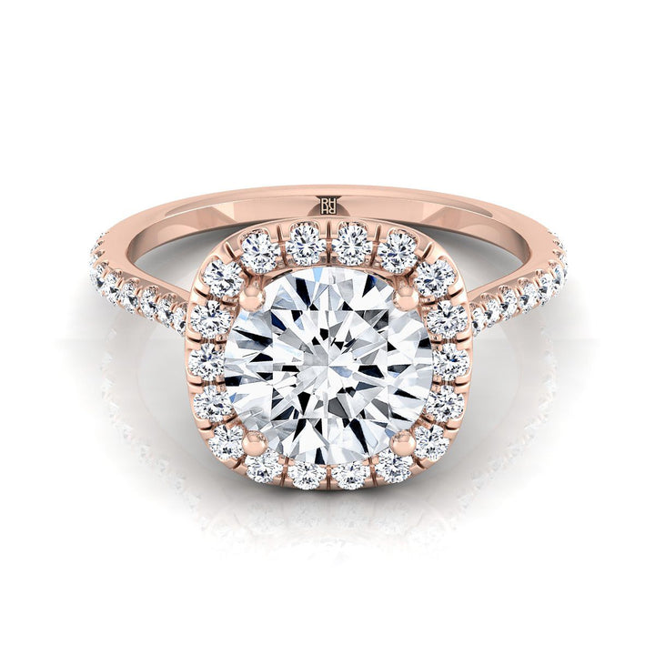 แสดงออกถึงสไตล์ที่สง่างาม แหวนหมั้นรูปทรงสี่เหลี่ยมแบบ Halo นี้พร้อมกับแถบเพชรแบบ Pave แสดงให้เห็นเพชรเจียระไนแบบ Brilliant Cut (h-i/vs 0.45ctw) ที่ถูกจัดวางอย่างสวยงามในตัวเรือนทองกุหลาบ 14k คลาสสิก