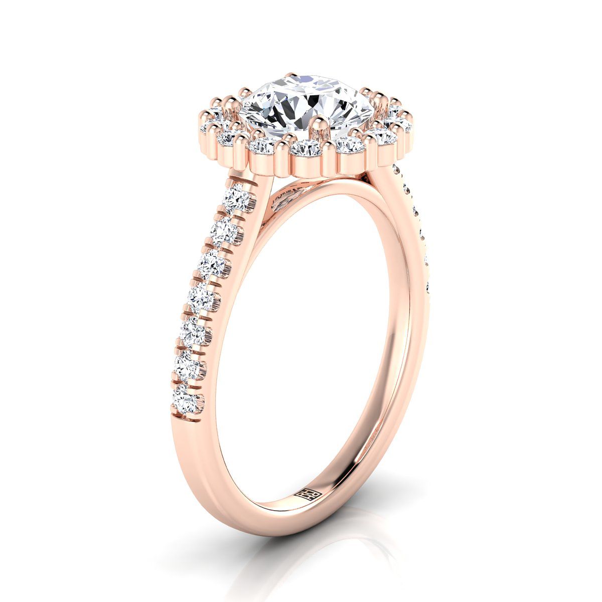 แหวนหมั้นเพชรทรงกลมเจียระไนแบบ Brilliant สีโรสโกลด์ 14K แบบ Halo พร้อมหนามเตยร่วม - 5/8 กะรัตรวม