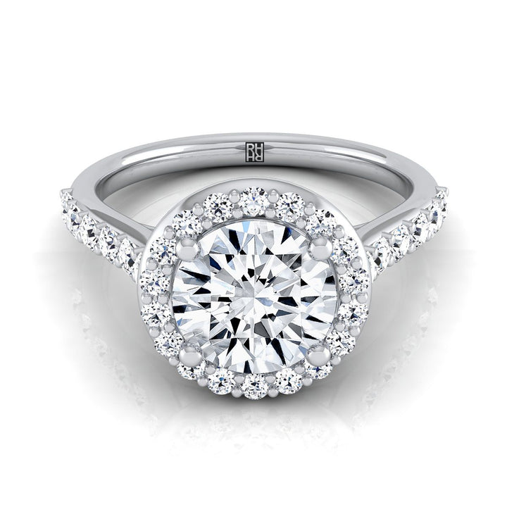 คลาสสิกและสง่างาม แหวนหมั้นเพชรฮาโลว์นี้พร้อมชิ้นส่วนชองค์แบบปาเว่ แสดงให้เห็นเพชรเจียระไนแบบบริลเลียนต์ (h-i/vs 0.50ctw) ที่ตั้งอย่างสวยงามในตัวเรือนทองคำขาว 14k แบบคลาสสิก
