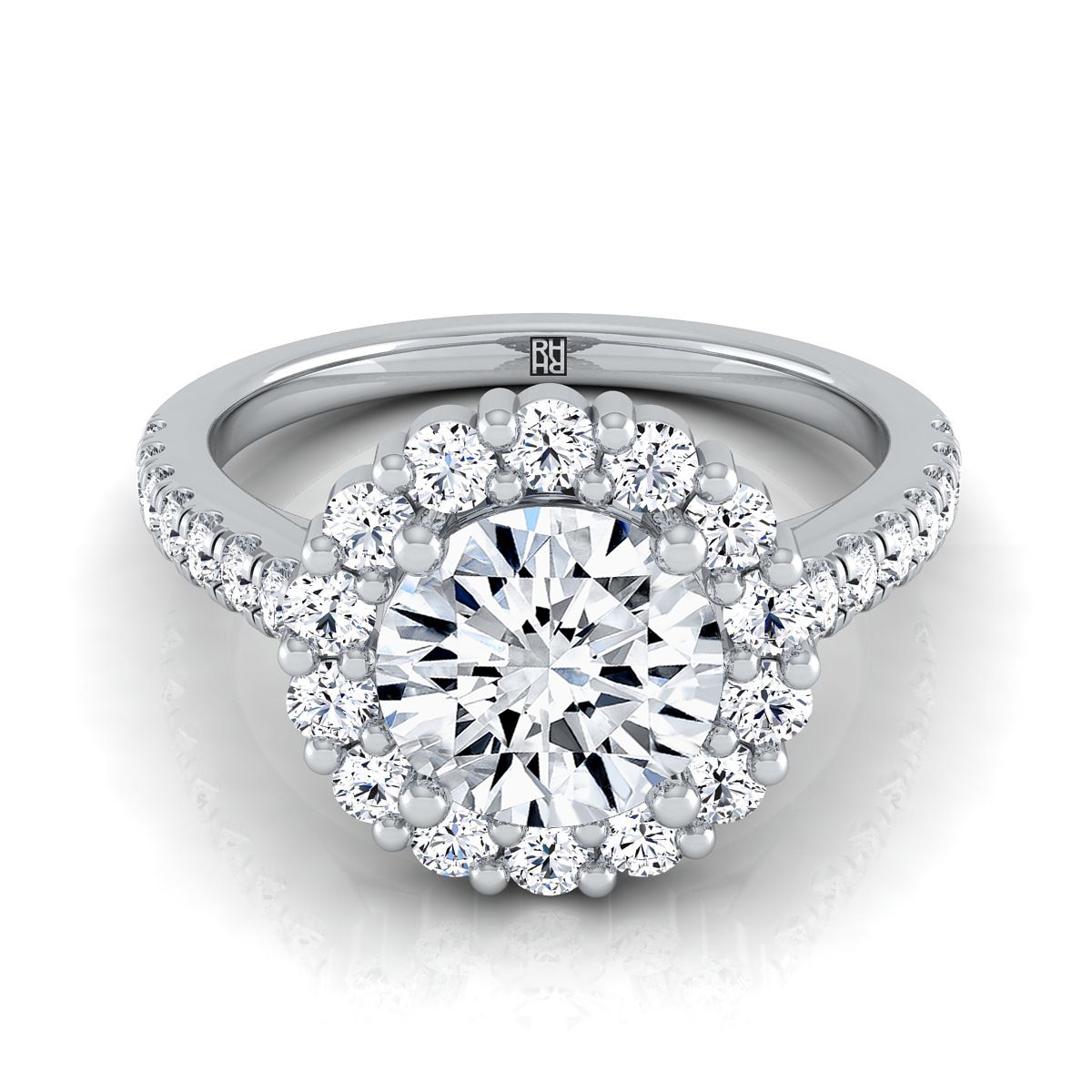 แหวนหมั้นเพชรทรงกลมเจียระไนแบบ Brilliant สีขาว 14K พร้อมฮาโลและหนามเตยร่วม - 5/8 กะรัตรวม
