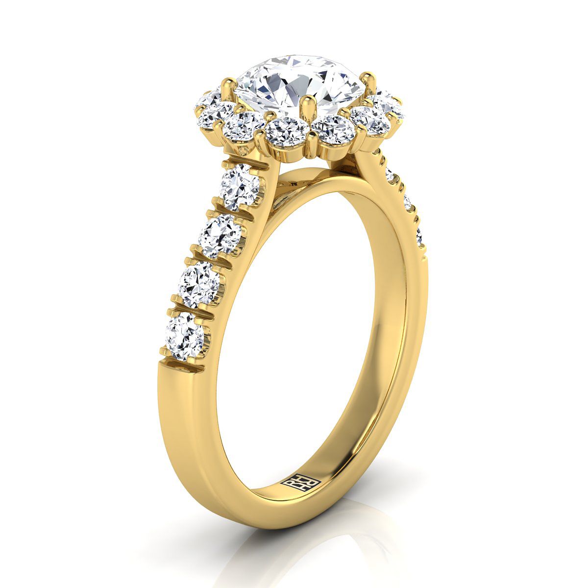 แสดงออกถึงสไตล์ที่สง่างาม แหวนหมั้น Halo Pave นี้นำเสนอเพชรเจียระไนแบบ Brilliant Cut (h-i/vs 1.05ctw) ที่ประดับอย่างสวยงามในตัวเรือนทองคำสีเหลือง 14k แบบคลาสสิก