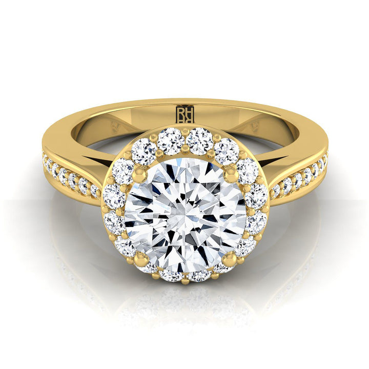 แหวนหมั้นเพชรทรงกลมเจียระไนแบบบริลเลียนต์ตรงแถวช่องฝรั่งเศสประดับเพชรแบบฮาโลว์ทองคำเหลือง 14K - 3/8 กะรัตรวม