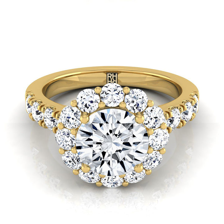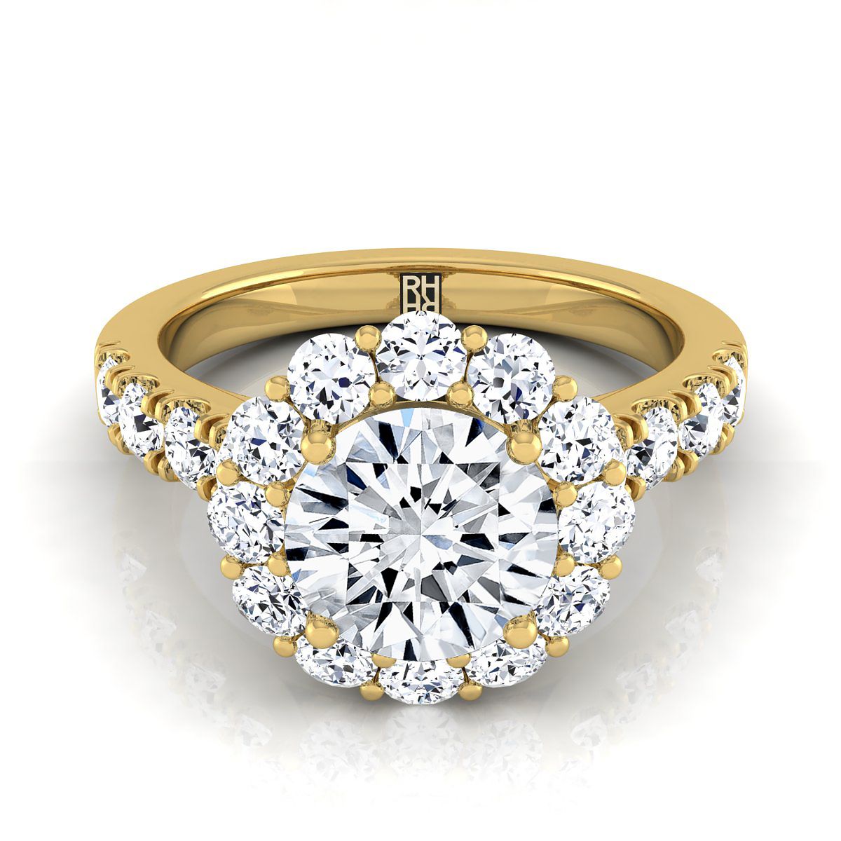 แถลงการณ์สไตล์ที่สง่างาม แหวนหมั้น Halo Pave นี้แสดงให้เห็นเพชรเจียระไนแบบ Brilliant Cut (h-i/vs 1.05ctw) ที่ประดับอย่างสวยงามในตัวเรือนทองคำเหลือง 18k คลาสสิกแบบ Pave