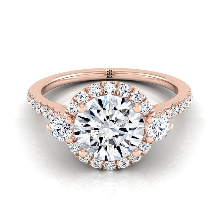 แหวนหมั้นสามเม็ดเพชรทรงกลมเจียระไนแบบ Brilliant ประดับฮาโล่ละเอียดทองกุหลาบ 14K - 1/3ctw